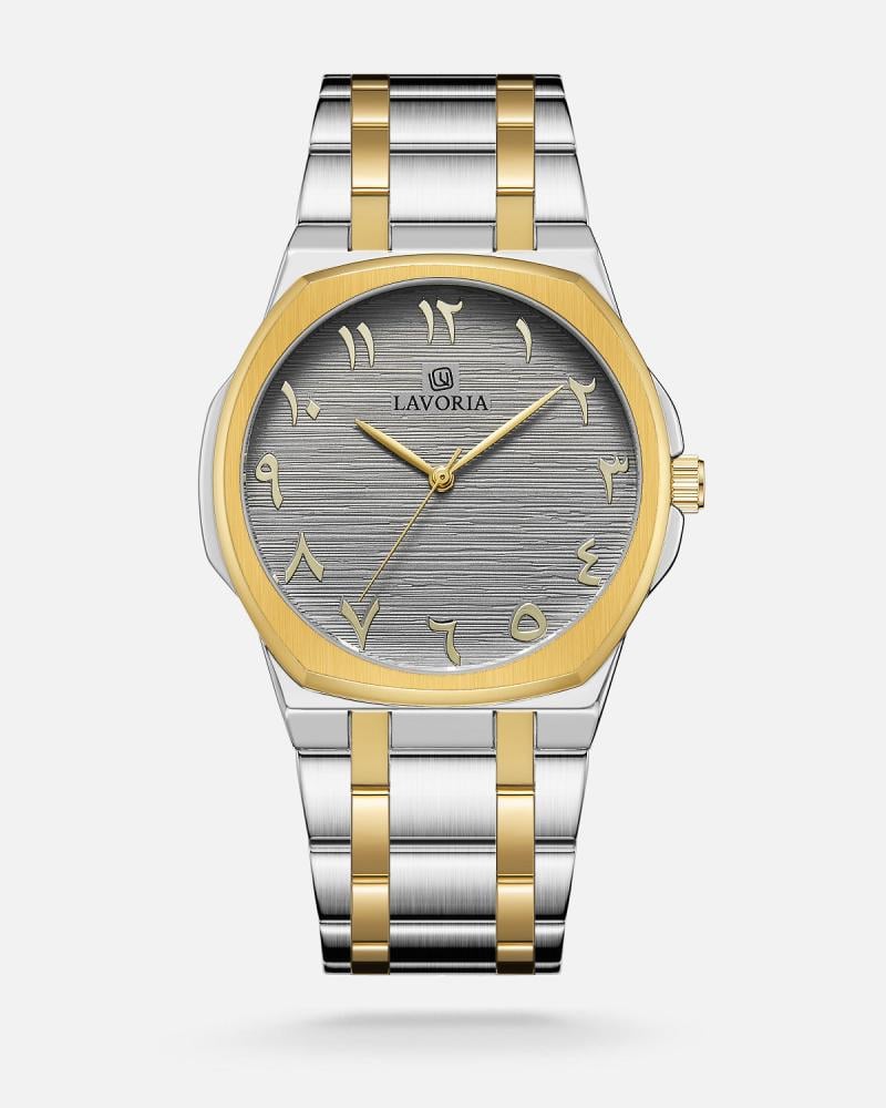 ساعة رجالية بتصميم أنيق، تتميز بقرص يحمل أرقامًا عربية كبيرة وواضحة،